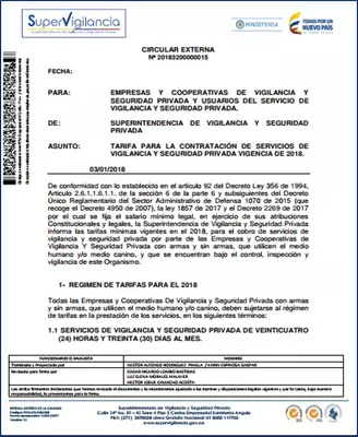 El Superintendente de Vigilancia y Seguridad Privada, Fernando Martinez Bravo, expide la circular N°015 de 2018, sobre las tarifas de contratación para servicios de vigilancia y seguridad privada vigencia 2018, de conformidad con lo establecido en el artículo 92 del Decreto ley 356 de 1994, y el decreto 2269 de 2017 por el cual se fija el salario mínimo legal; se da a conocer el regimen de tarifas al que deben sujetarse todas las empresas y cooperativas de vigilancia y seguridad privada con armas y sin armas que utilicen el medio humano y/o canino y que se encuentran bajo el control, inspección y vigilancia de este organismo.