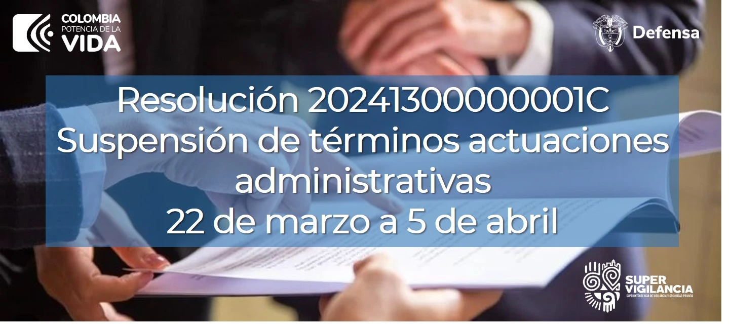 Conoce aquí el detalle de la Resolución 20241300000001C mediante la cual la Superintendencia de Vigilancia y Seguridad Privada suspende los términos de las actuaciones administrativas a cargo de la entidad y se dictan otras disposiciones, como medida transitoria entre el 22 de marzo y el 5 de abril de 2024.