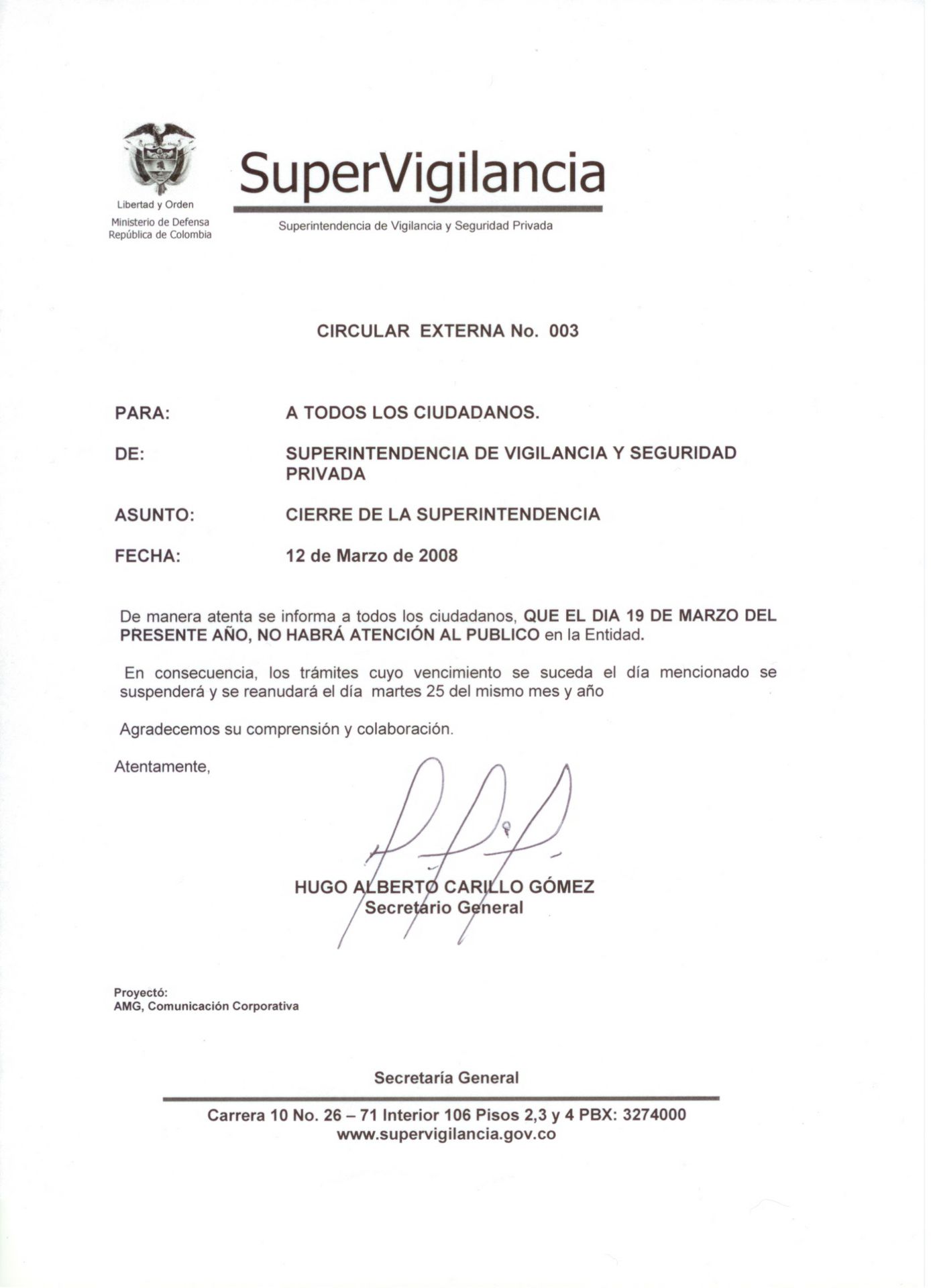 CIRCULAR EXTERNA No 003 de 12-03-08 Cierre de la Superintendencia