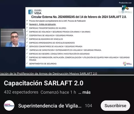La Superintendencia de Vigilancia y Seguridad Privada y BASC Colombia invitan a todos los interesados a revivir la capacitación virtual realizada sobre la Circular Externa No. 20240000245 del 14 de febrero de 2024, por medio del cual se imparten directrices para la implementación Sistema de Administración de Riesgos de Lavado de Activos Financiación del Terrorismo y Financiación de la Proliferación de Armas de Destrucción Masiva SARLAFT 2.0