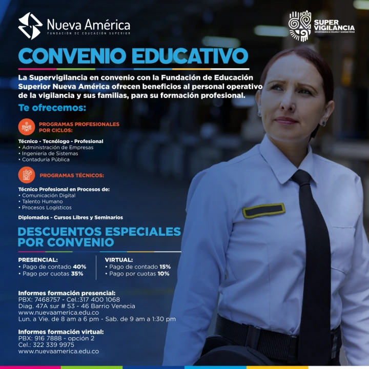 La Superintendencia de Vigilancia y Seguridad Privada continuando con su compromiso de fortalecer la Política de Seguridad Humana, recuerda a las empresas y personal operativo de las diferentes regiones de Colombia que se encuentra en marcha el Convenio Educativo con la Fundación de Educación Superior Nueva América, en donde, de manera presencial o virtual, se pueden cursar diferentes programas educativos, siempre en pro de nuestro recurso más importante: El personal operativo y sus familias.