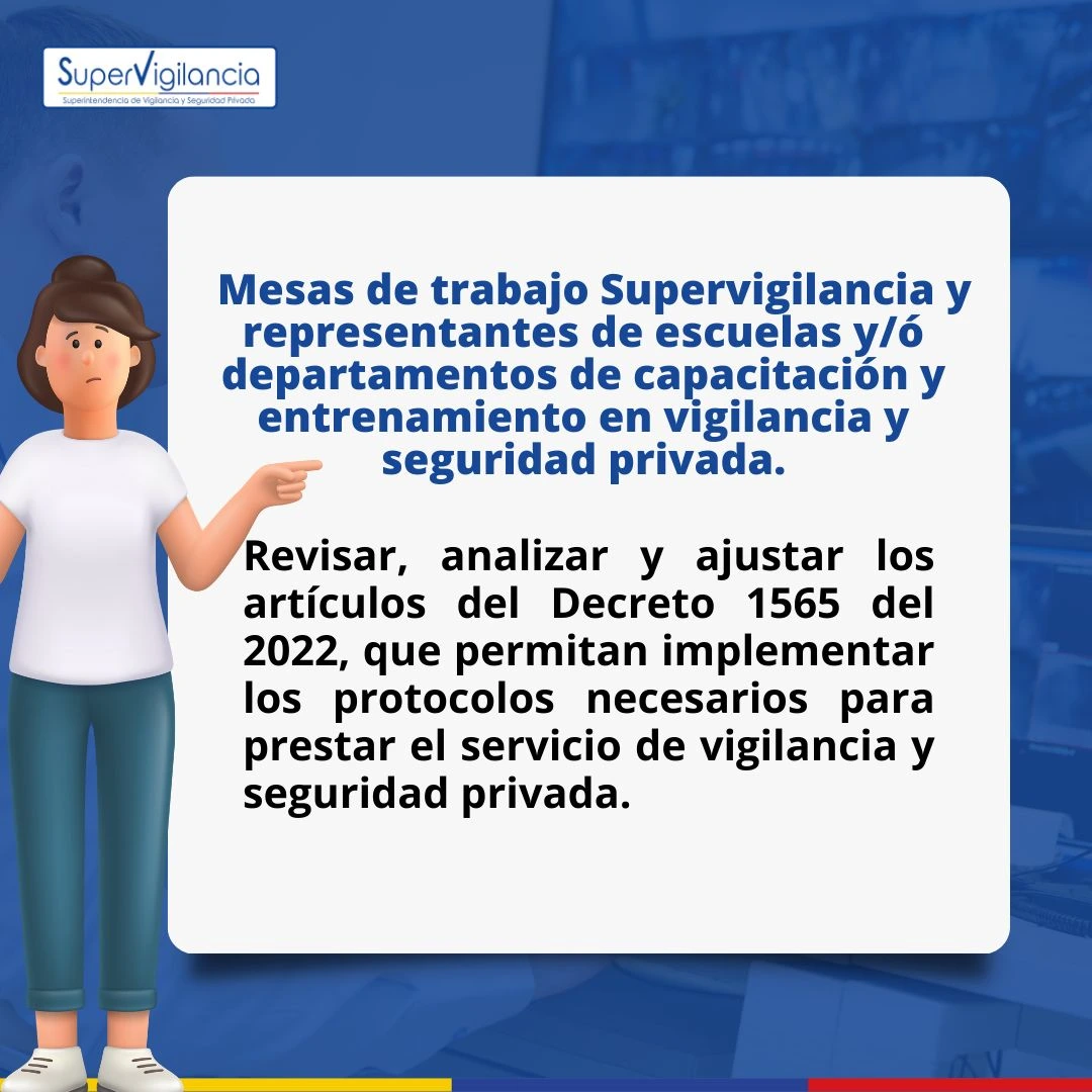 Invitamos a todas las escuelas y departamentos de capacitación y entrenamiento en vigilancia y seguridad privada, a enviar sus comentarios frente a la revisión del Decreto 1565 de 2022, el cual se está analizando en el marco de las mesas de trabajo con representantes de los centros de formación del sector de la vigilancia y la seguridad privada.